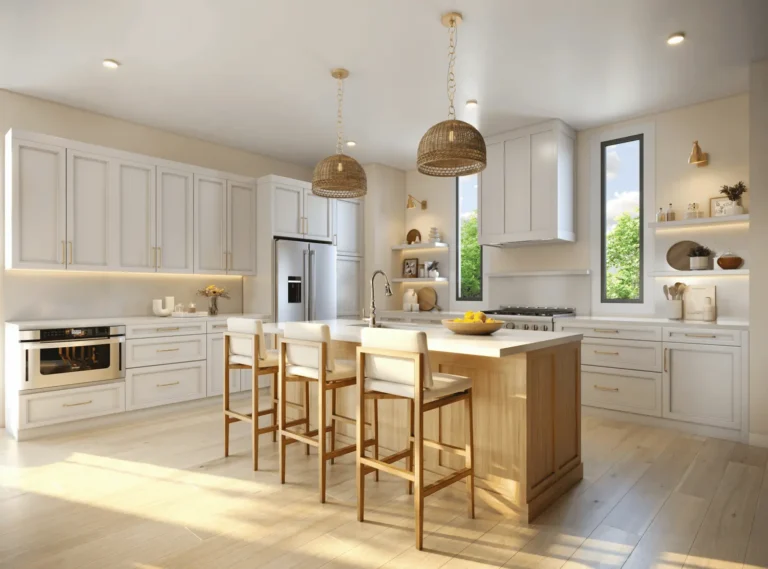 The Airlie package is bright and ethereal, in keeping with an easy-going coastal lifestyle. The color palette is softer, between warm whites and muted blue/green accents, across materials chosen as reminiscent of the coast: natural stone and rippled-glass texture tiles, light colored engineered hardwood floors, wicker pendants, and bright hardware. The Airlie is tailored for those who are most at home in the sun, sand, and sky of the Carolina coast.